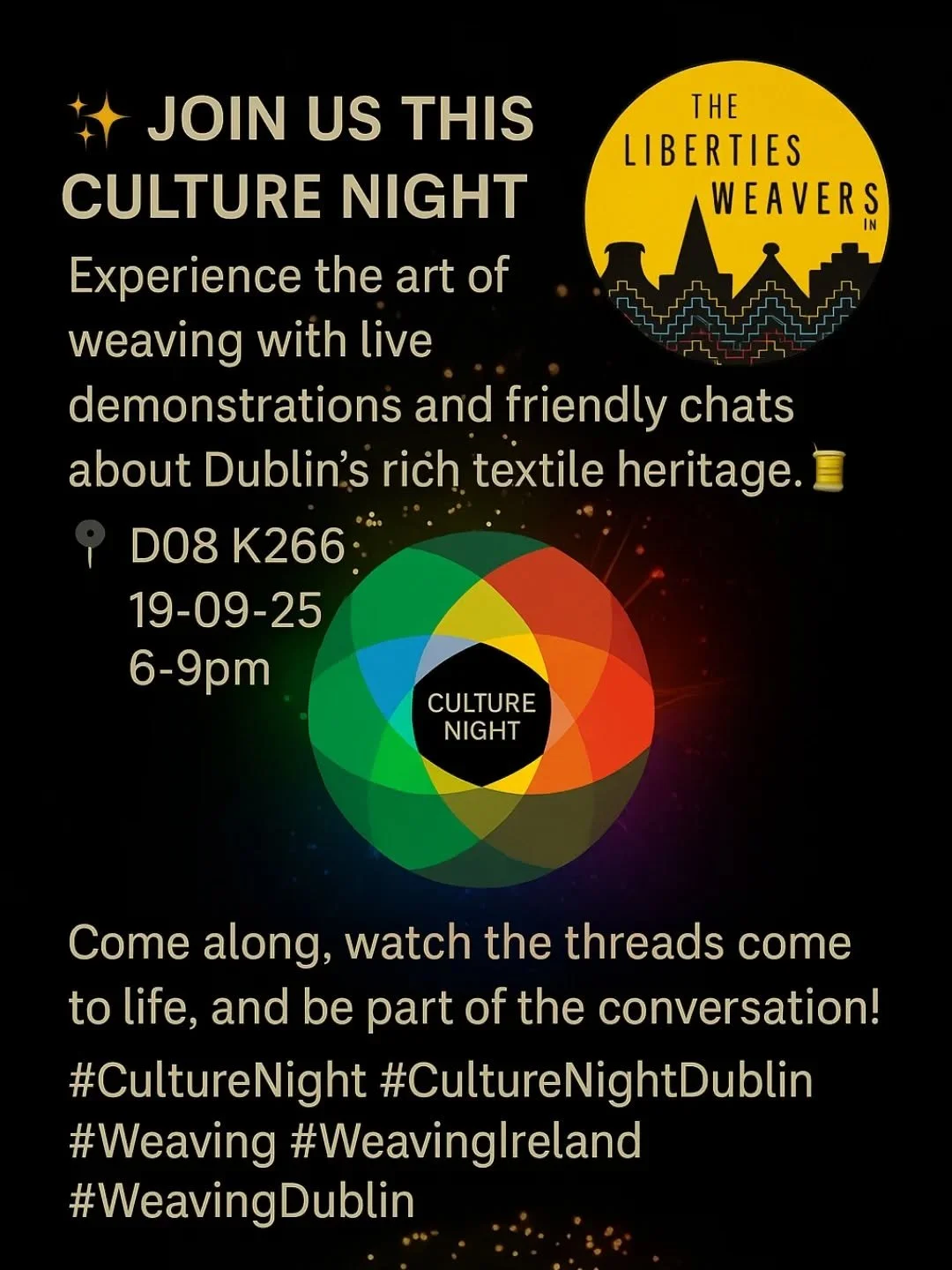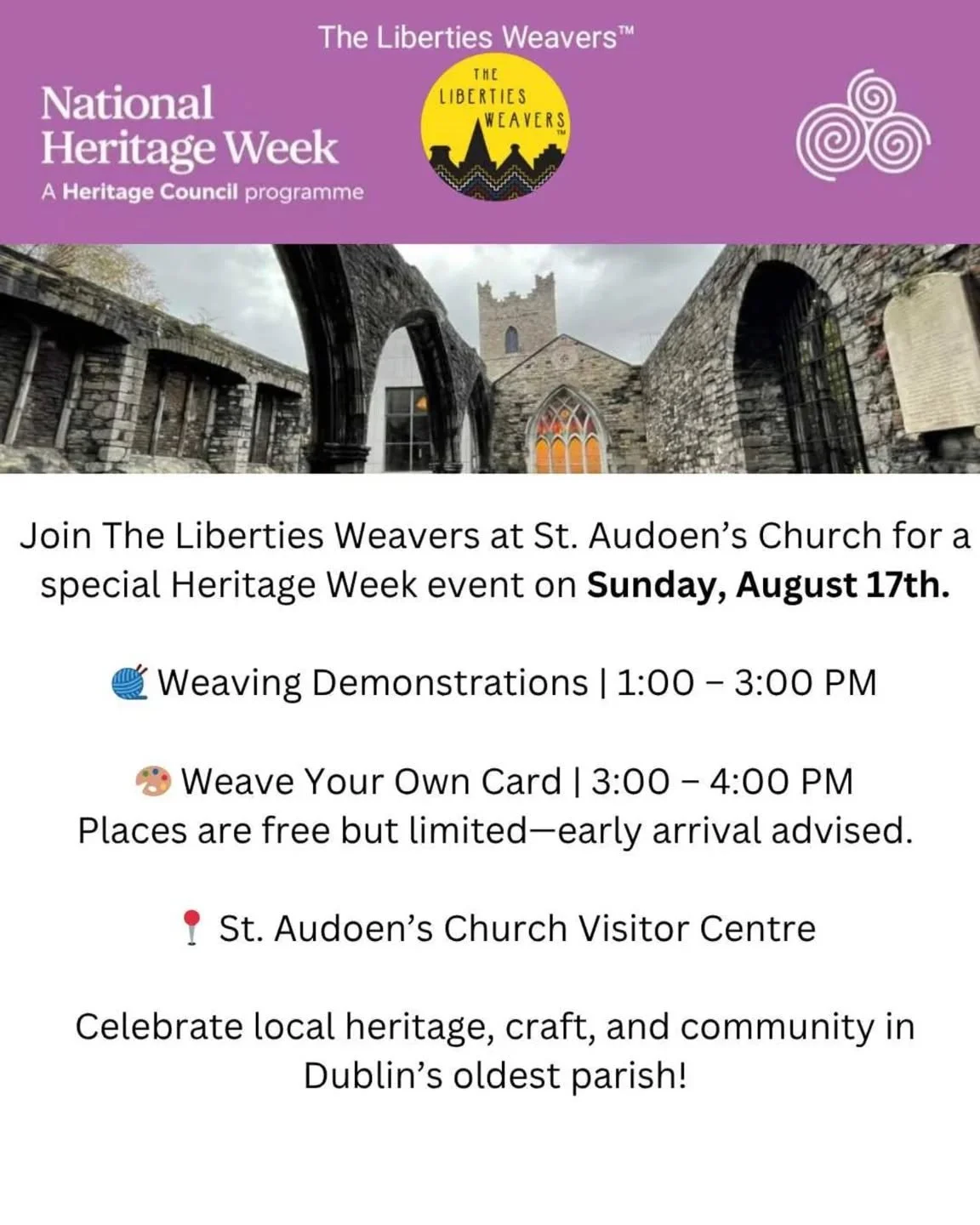 The Liberties Weavers™ aims to revive the rich textile heritage of The Liberties, Dublin, by offering traditional weaving workshops, educational walking tours, and authentic, locally made woven products.